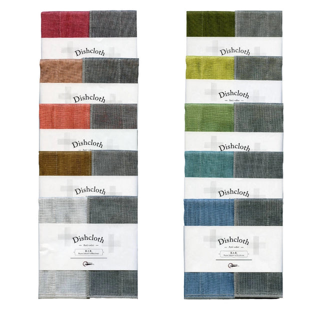 RIB Knit is a double knit fabric that knits the fabric in a vertical ridge called a rib and is very stretched in the crosswise direction. The dishcloth contains binchotan charcoal (of the highest quality) infused into its fibers. The charcoal naturally absorbs the odors that typically accumulate in a dishcloth. One side of this product has a naturally dyed color, and the other side remains in natural binchotan gray.
